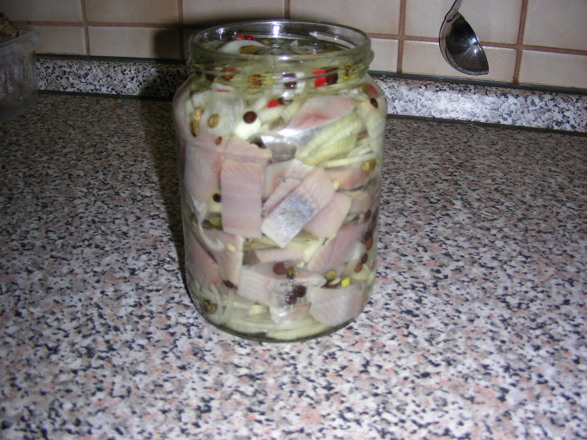 1) Očištěné a pokrájené ryby řádně nasolím, dám do třílitrovky a nechám v lednici stát 3-5 dnů